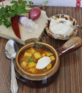 Вскипятите примерно 3 литра воды, затем добавьте очищенный, нарезанный кубиками картофель, лавровый лист и очищенную, но целую луковицу. Слегка посолите и варите на среднем огне, пока картофель не станет мягким (максимум 15-20 минут). Разогрейте масло, всыпьте муку, дайте ему вспениться, затем отставьте и добавьте красный перец. (то есть ранташ) Влейте его в суп, постоянно помешивая, наконец, влейте немного горячего супа в палачинтовку, где был ранташ, помешайте и влейте его обратно в суп. Доведите до кипения, приправьте солью и уксусом. По желанию посыпьте петрушкой. Подавайте со сметаной или с острым перцем, или с фиолетовым луком и хлебом.