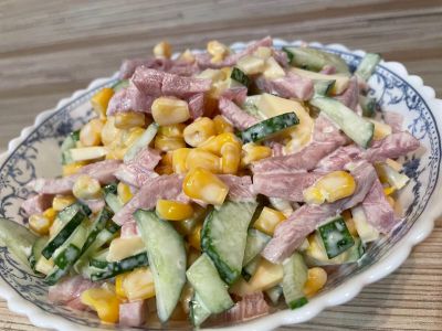 Ветчина и кукуруза – проверенные временем салатные ингредиенты. Их хорошо дополняют творог, свежий огурец, вареные яйца, сухарики. Сегодня мы приготовим салат с ветчиной, кукурузой, свежим огурцом и сыром! Готовить его можно хоть каждый день! Выходит отлично, пальчики оближешь!