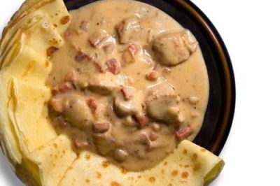 1 ст. ложка борошна, 100 г сметани, 100 г вершків, 200 г молока, спеції – за смаком.