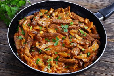 Посипати сіллю, перцем черним і залишити на вогні, поки гриби не смажутся і пустят сік добавимо полуготу мясо посипомо невеликою кількістю солі, перцю та гострого перцю, щоб зробити його трохи гострим, накрийте кришкою та варіть до м’якості протягом години. Перевіряйте іноді, чи потрібна вода під ним, але гриб сам виділяє багато соку.Коли м’ясо повністю розм’якшиться, змішайте сметану з невеликою кількістю борошна і кількома ложками соку перкелте вилейте в страву і розмишуте його. та закипятить хвилиночку так шоби сок став густим Нарешті, покладіть смажений сало назад на сковороду.