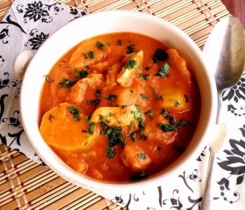ПАПРИКАШ і картопля, але також з баклажанами, курячою грудкою і помідорами, і це дуже смачно. Оскільки великі, м'ясисті помідори досить несмачні в цю пору року, я використовувал проціджений томатний сік, що був у мене в коморі. Але я обов'язково спробую його зі свіжими помідорами влітку.